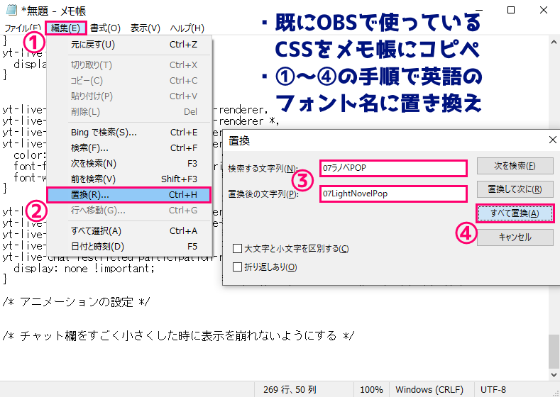- 既にOBSで使用しているCSSのフォント名部分を全部置き換える(オススメ)