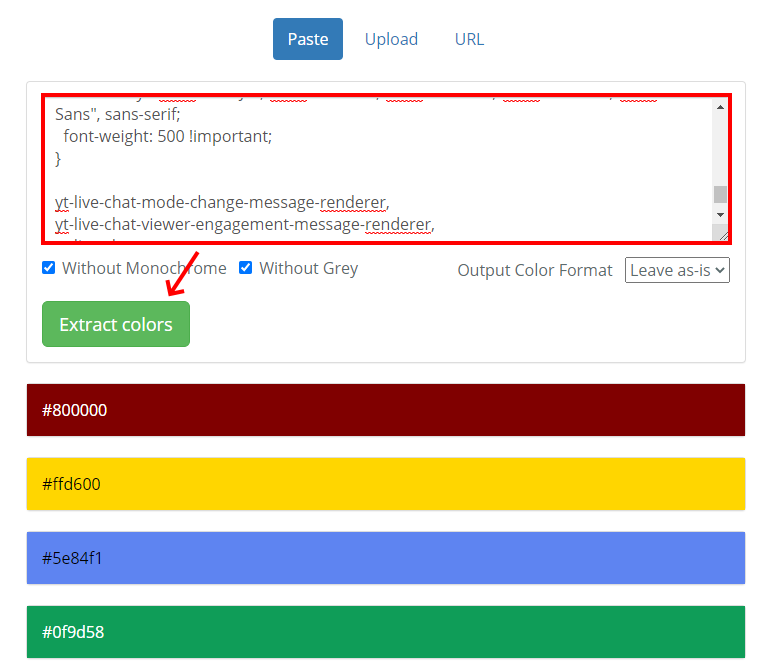 CSS Color Extractor に作成済みのCSSをコピペして「Extract Colors」をクリックするとCSSで使っている色の一覧が表示されます。