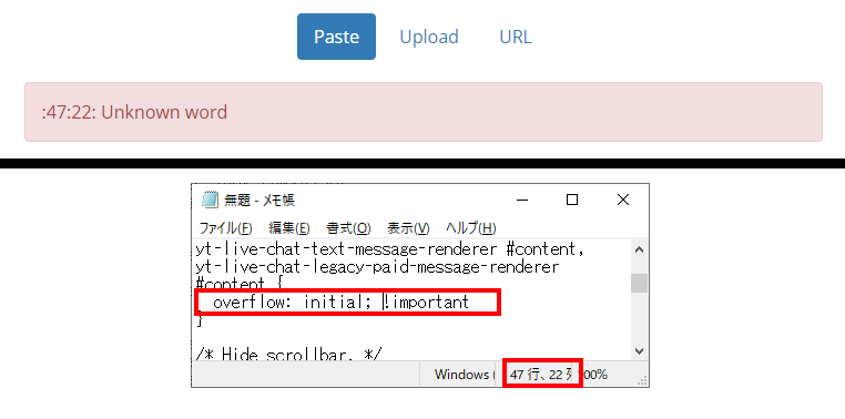 この場合は、メモ帳などで overflow: initial; !importantと書かれている箇所を消してからコピペし直せば上手くいくパターンが多いと思われます。