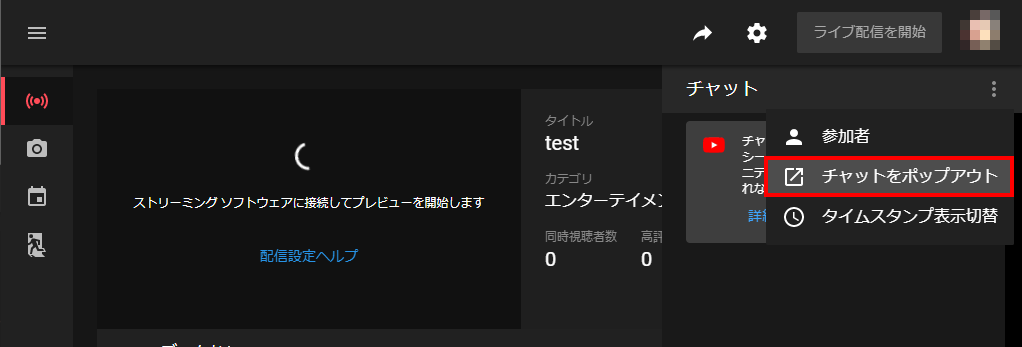とりあえずこの手順を試してみてください。- YouTube Studioのライブ配信画面で「チャットをポップアウト」を選択する。