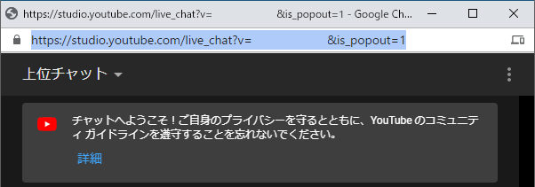 そのため、他の人が配信中のURLから v=*********** の部分をコピーすることで、他の人のチャット欄を自分のテストに使うことができます。(チャット欄をOBSで表示するだけなので、相手に迷惑をかけることはありません)